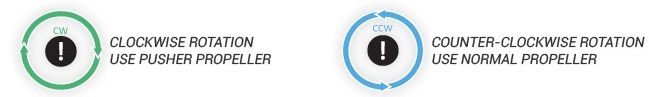 The diagrams above show two types of propellers: clockwise (called pushers) and counterclockwise (called pullers). The most reliable to recognize the correct propeller type by its shape as shown below. The thicker edge is the leading edge which moves in the direction of rotation. The trailing edge is more radical scalloped and usually thinner.