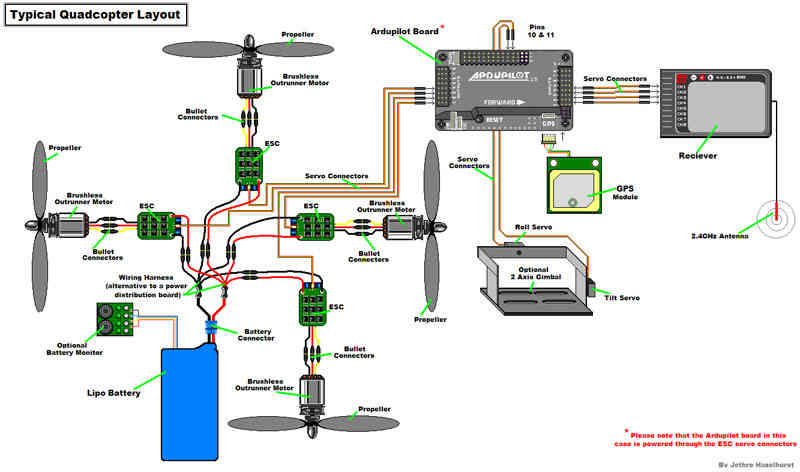 The diagram below is an overview of how an APM2 can be connected to a receiver, ESC, GPS and even a camera gimbal.