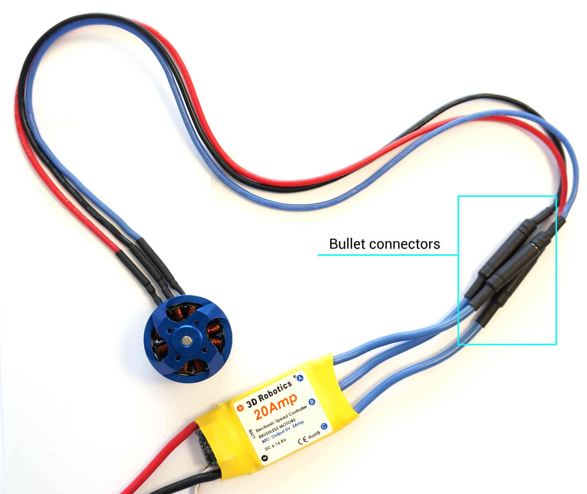 You will need to connect motor cables to electronic speed controller (ESC) bullet connectors (each motor must connect to only one ESC).