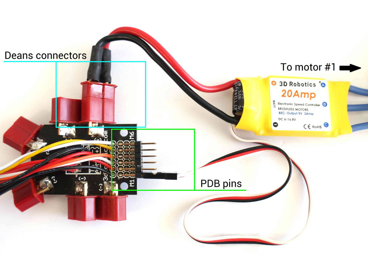 Connect ESC Deans connectors to Power Distribution Board (PDB) Deans connectors. Connect three-wire cables from the ESCs to the PDB signal pins according to motor number (see link above to find the motor number configuration for your frame). Connect the ESC for motor 1 to the PDB pins marked M1, motor 6’s ESC to the pins marked M6, etc.