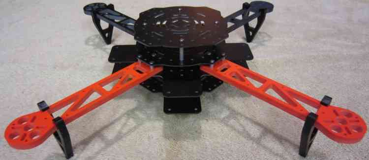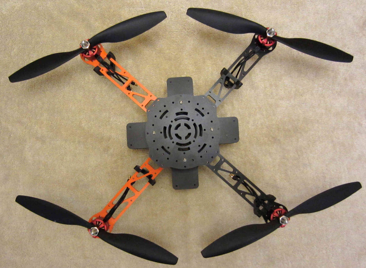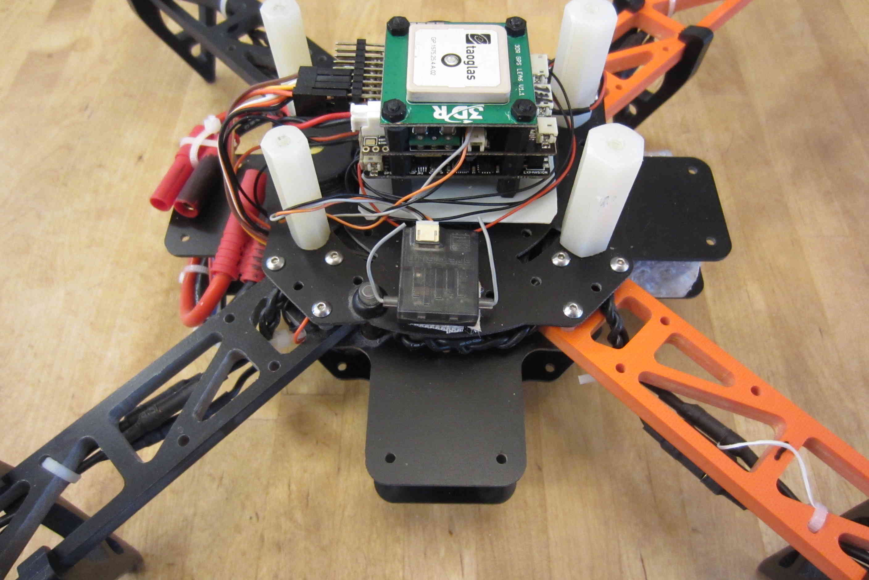 Adhere the Pixhawk to the top of the frame with the arrow pointing to the front (between the 2 orange arms on mine).