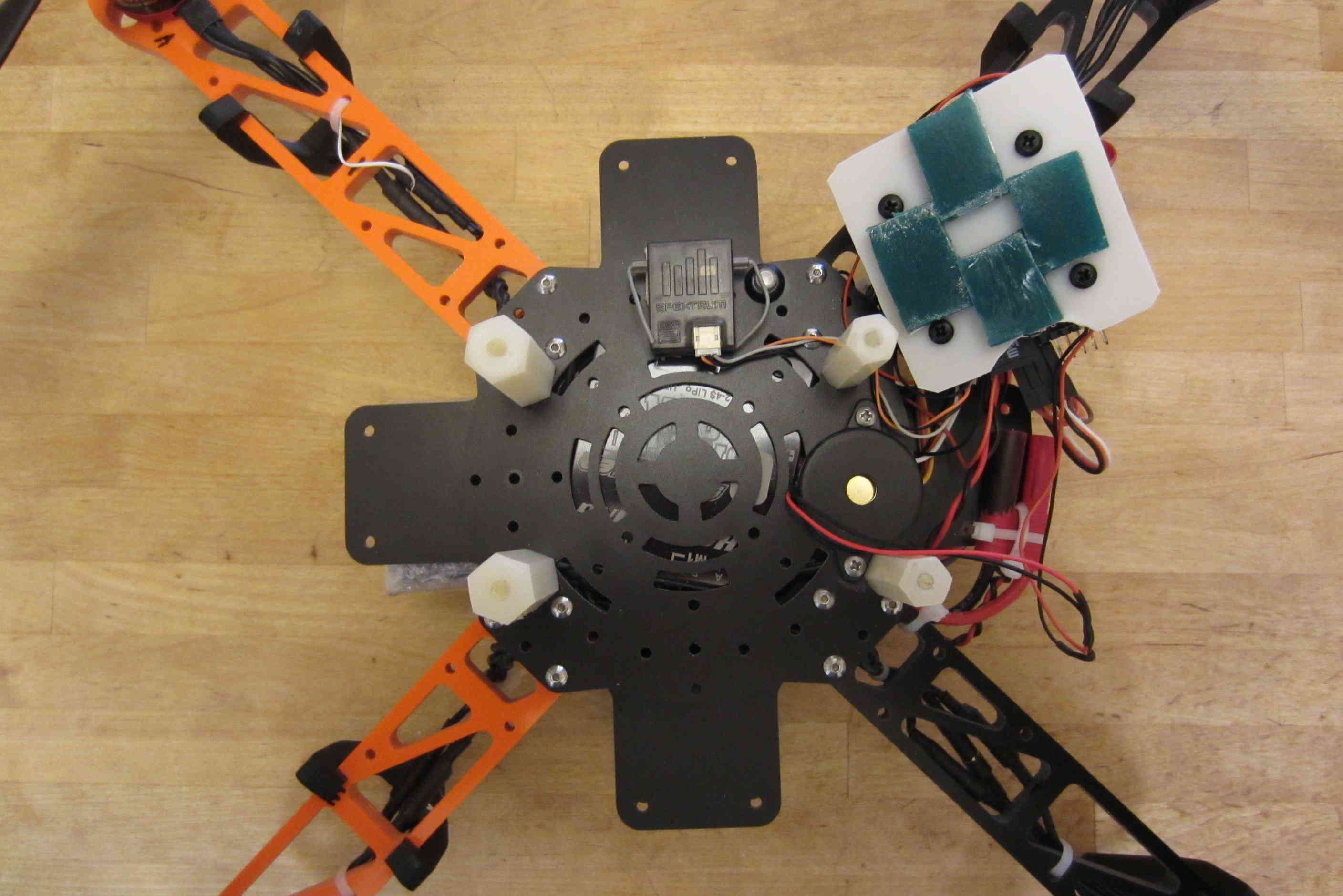 Adhere the rectangle to the center of the top of the frame with the servo connector facing to the rear (between the black frame arms).