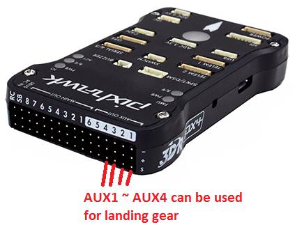 Most retractable landing gear will require just a single PWM cable to connected to one of the AUX outputs on the back of the Pixhawk (AUX1 ~ AUX4).
