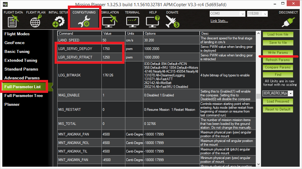 Use the Mission Planner’s Full Parameter List (or equivalent) to set the following parameters: