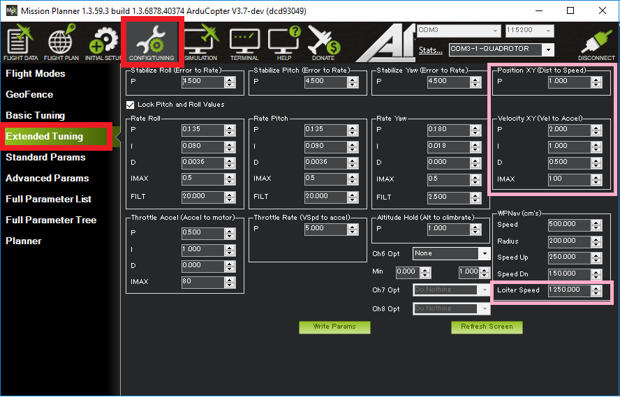 LOIT_BRK_JERK: max change in acceleration in cm/s/s/s while braking. Higher numbers will make the vehicle reach the maximum braking angle more quickly, lower numbers will cause smoother brakingPSC_POSXY_P: (shown as “Position XY (Dist to Speed)” at the top right of the screen shot above) converts the horizontal position error (i.e difference between the desired position and the actual position) to a desired speed towards the target position. It is generally not required to adjust thisPSC_VELXY_P(shown as “Velocity XY (Vel to Accel)”) converts the desired speed towards the target to a desired acceleration. The resulting desired acceleration becomes a lean angle which is then passed to the same angular controller used by Stabilize mode. It is generally not required to adjust this