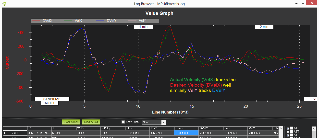 Viewing the loiter’s horizontal performance is best done by downloading a dataflash log from your flight, then open it with the mission planner and graph the NTUN message’s DesVelX vs VelX and DesVelY vs VelY. In a good performing copter the actual velocities will track the desired velocities as shown below. X = latitude (so positive = moving North, negative = South), Y = longitude (positive = East, negative = West).