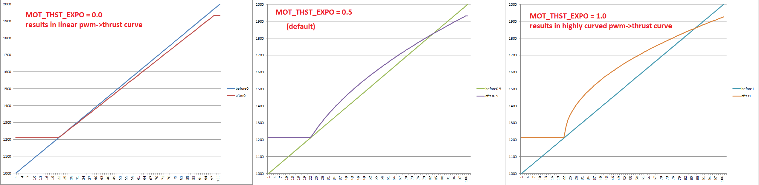Some ESCs have built-in linearizing curves and the default EXPO value of “0.65” will cause stability issues, requiring thrust stand measurements to adjust the EXPO. Typically, values of “0” to “0.2” will result.