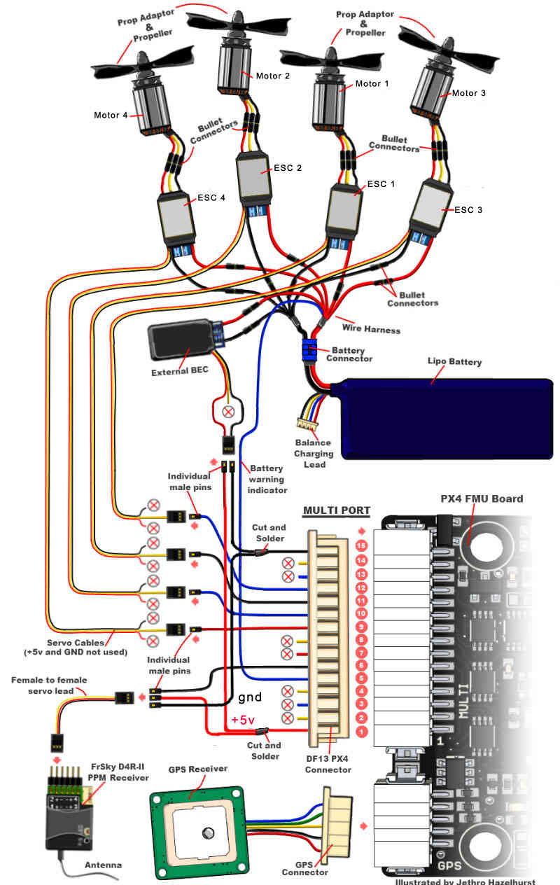 A special cable that fits into the PX4’s main “Multi” connector will allow you to perform the primary wiring and it is available from 3DRobotics LINK_BROKEN