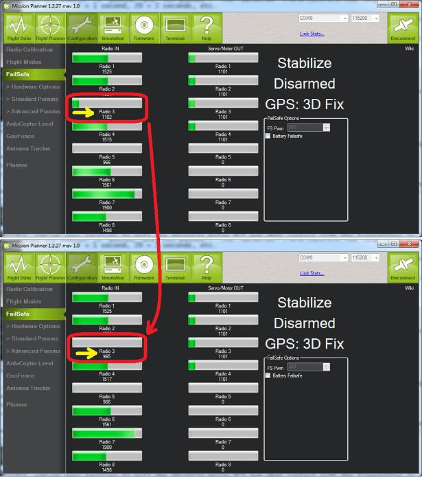 You can check your failsafe by performing the following tests with the autopilot connected to the Mission Planner either via a USB cable or telemetry link. You can complete these tests without plugging in your LiPo battery but if you do connect a battery you should first remove the propellers.