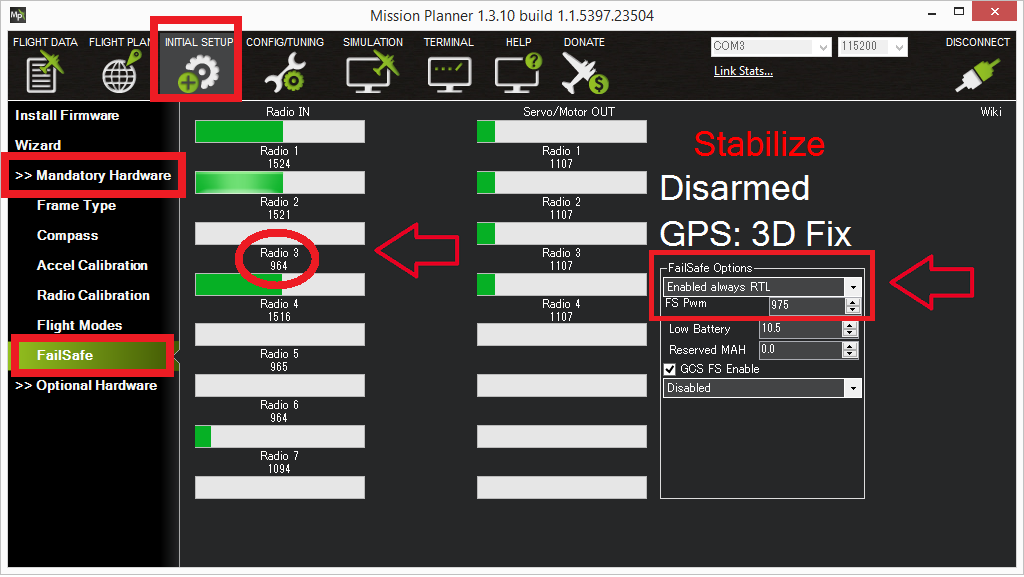 The FS_THR_VALUE parameter can be set in the Mission Planner full parameter list or full parameter tree, or can also be set using the Mission Planner FS PWM value in the Initial Setup >> Mandatory Hardware >> Failsafe menu. - At least 10 PWM higher than your Channel 3’s PWM value when the throttle stick is fully down and the transmitter is off - At least 10 PWM lower than your channel 3’s PWM value when the throttle stick is fully down and the transmitter is on - Above 910 PWM