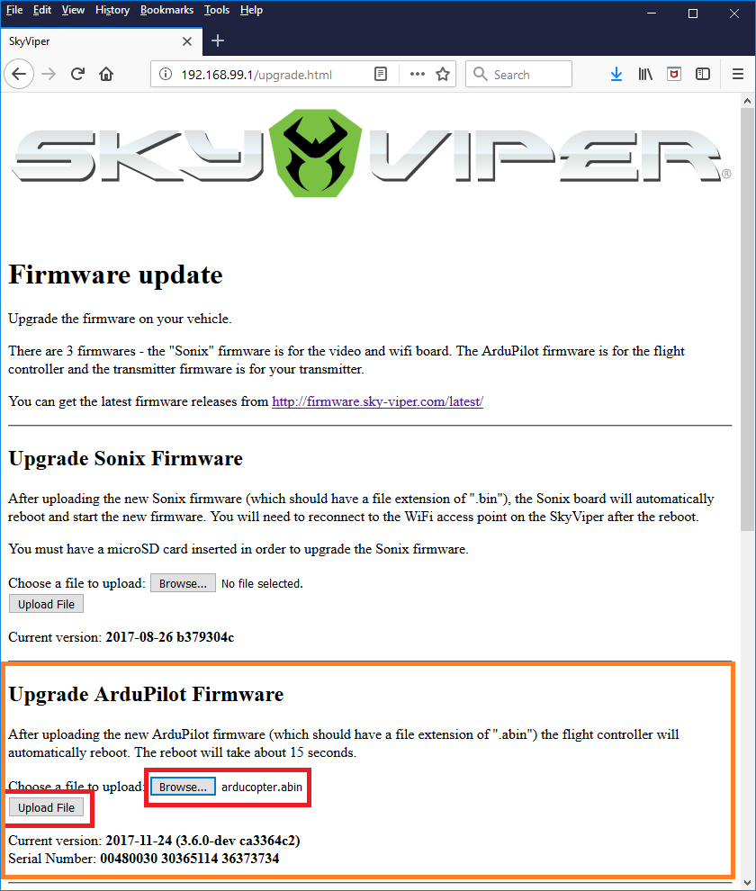 in the “Upgrade ArduPilot Firmware” section, push the “Browse” button and select the *.abin file downloaded above
