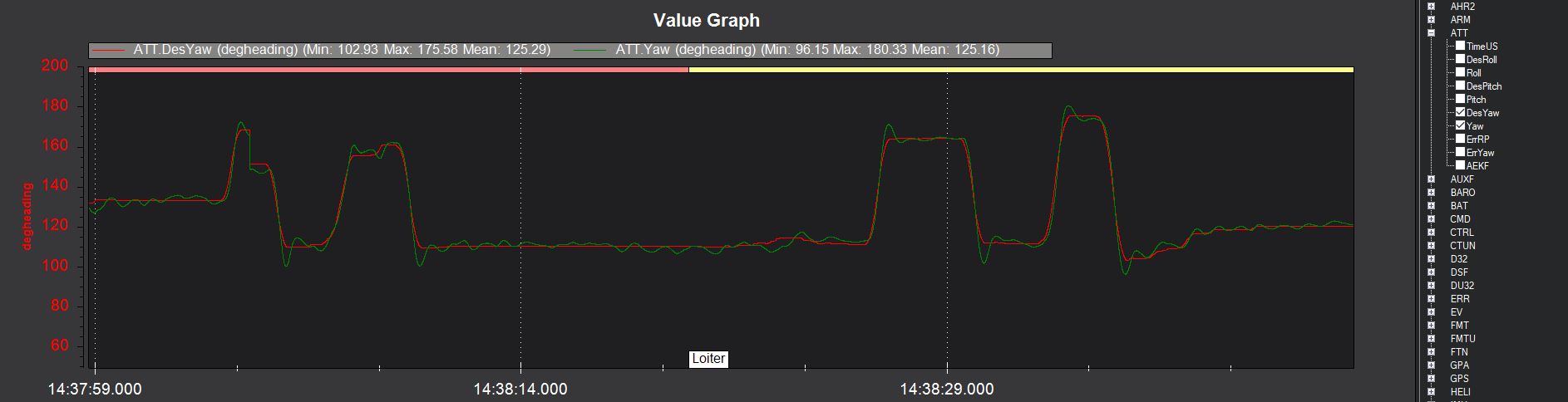 The tune quality can be checked by examining the logs for ATT.DesYaw vs ATT.Yaw as shown below for an imperfect but flyable tune: