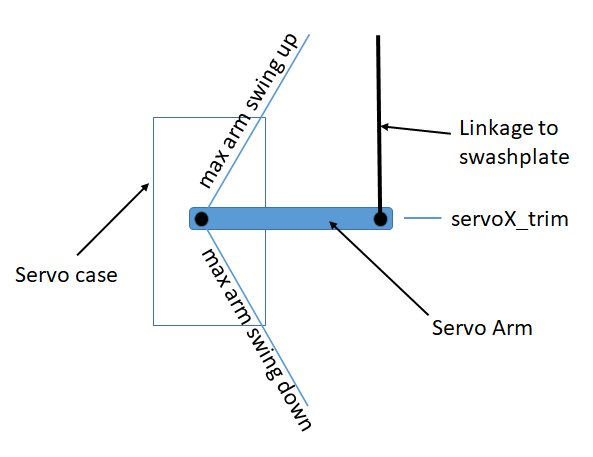 If you aren’t using the Linearize Servo feature, then you will use the servo trim parameters to level your swashplate. Set the H_SV_MAN parameter to 1. Adjust the transmitter throttle stick (collective) until the servos are nearly perpendicular to the shaft. Adjust SERVO1_TRIM, SERVO2_TRIM, and SERVO3_TRIM until the swashplate is level.