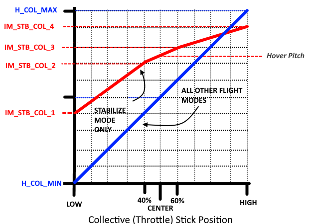 ArduPilot provides a programmable curve for STABILIZE mode to allow “softening” of the curve to provide smoother pilot control. This curve is set by the IM_STB_COL_x parameters as shown in the graph below. All other modes use the collective extremes and a straight line curve that were setup above.