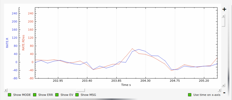 Below is a graph showing an example of Rate Roll Desired vs actual Rate Roll. The peak corresponds to a rapid stick input and the amplitude (height) of the peaks should be approximately the same with no more than 100 milliseconds offset.