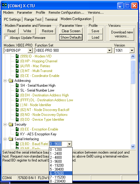 Select proper modem from drop down menu (for the 900Mhz ones recommended above select “XBP09-DP”; for 2.4GHZ Xeebee Pro 2 select “XBP24-B”)