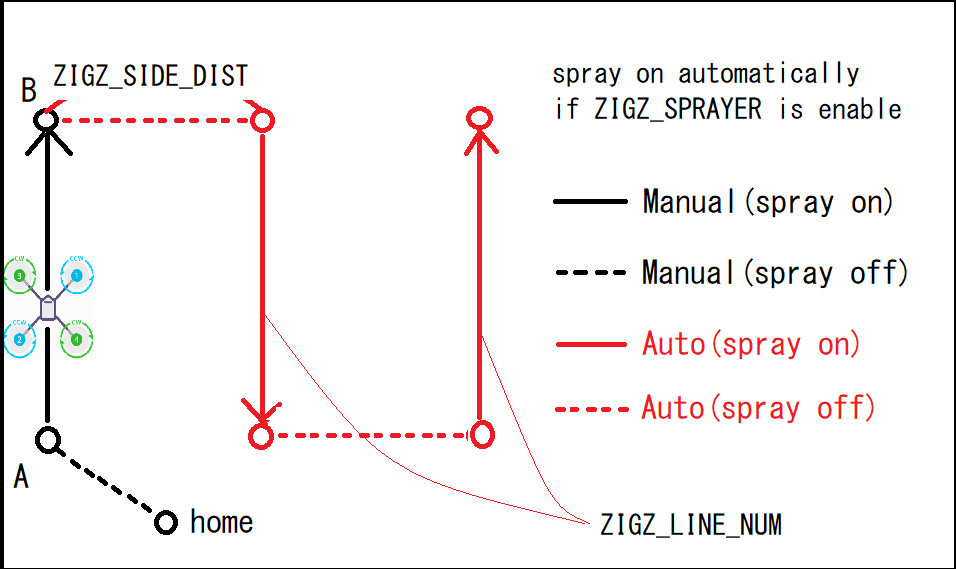 Upon activation, the vehicle will move in ZIGZ_DIRECTION with respect to its heading for ZIGZ_SIDE_DIST, then proceed to cross the field until the opposite ZigZagWP is reached. It will then wait for ZIGZ_WP_DELAY to allow sprayer to fully stop and then move ZIGZ_SIDE_DIST down the side of the field again to proceed back across the area. It will do this for ZIGZ_LINE_NUM times (-1 = infinite until switched out of this mode, =0 will only move to the first field crossing position, but not proceed further).