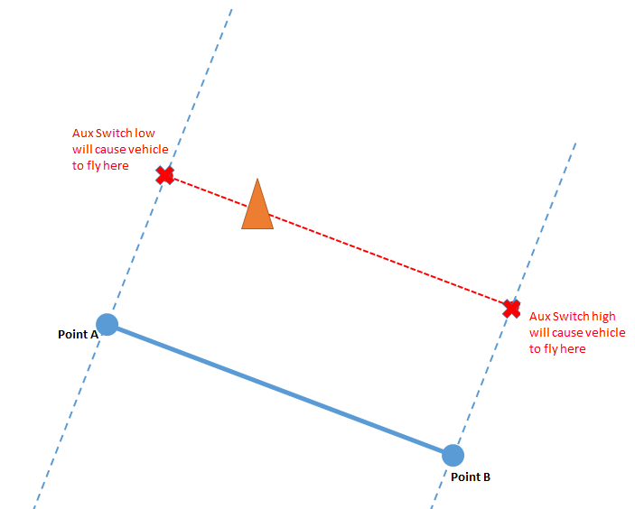 The switch can now be used to start the vehicle flying autonomously (at the current height) to either side of the field. Once the vehicle reaches the other side it will revert to manual control. The pilot can also regain manual control by moving the auxiliary switch to the middle position or by changing the flight mode.