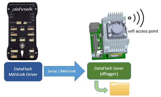 Dataflash logs are streamed to the companion computer via MAVLink and stored on the companion computer’s filesystem (as well as on the pixhawk’s dataflash). Dataflash log files can then be quickly downloaded (over wifi) using a script (Windows users may use apsync-download-logs) or you may pull the SD card out of the companion computer.