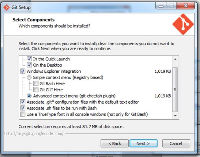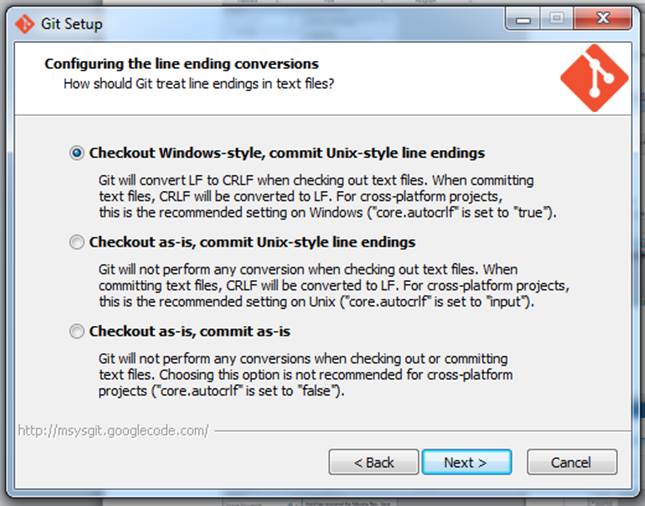Select the Checkout Windows item and the Next button then Select the Run Git from Windows item and the Next button.