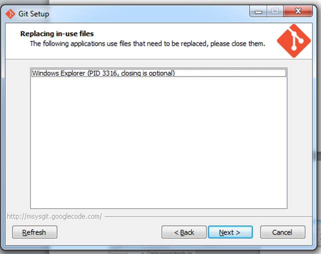 Click the Next button in the Replacing in Use Files Screen, then wait for Git to finish loading