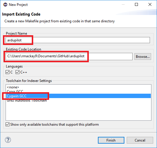 When the “New Project” window appears select the folder into which ardupilot was cloned and select the Toolchain to be “Cygwin GCC”
