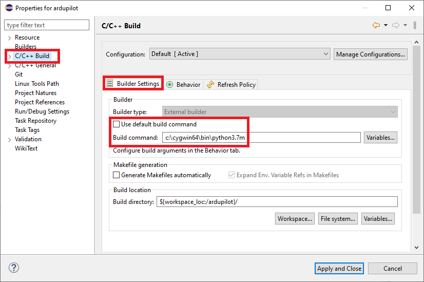 When the “Properties for ardupilot” window appears, under “C/C++ Build”, uncheck “Use default build command” and enter