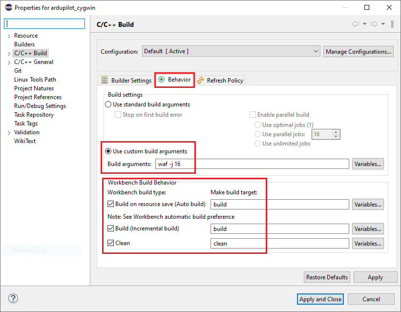 waf. Additional arguments such as-j 16may be added here. The argument-j 16configures Cygwin to use 16 logical processors of the 8 core machine in this example.Setting “Workbench Build Behavior” will allow the use of built-in buttons for clean and build all targets. Note if you prefer to only build for a single vehicle type using these buttons change “build” to “copter”.