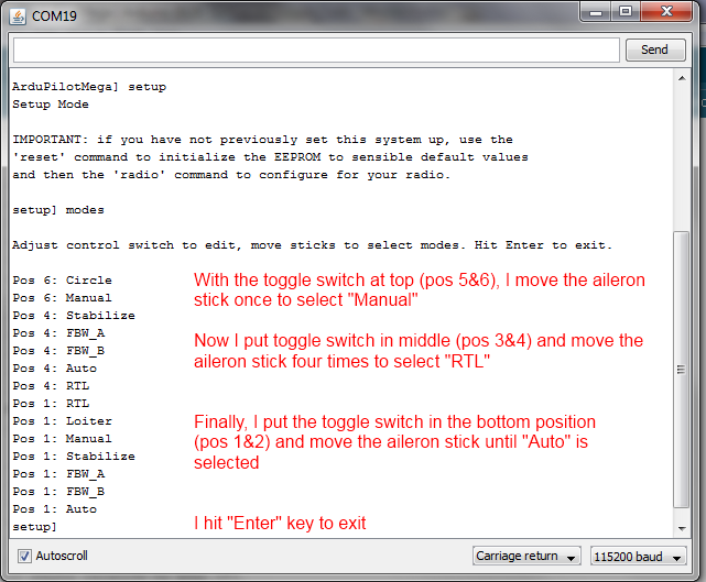 Here’s how to set your flight control modes: In the CLI, enter setup mode. Type “modes” and press return. You can now see the flight modes displayed as you move your control switch to each position. If you want to change your mode, use the rudder/aileron control stick on your radio. Just move the stick to the right or left and the mode will increment. Hitting Enter will exit the mode and save your changes. See this example: