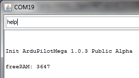 You can now enter commands by typing them at the command prompt. You can always type “exit” to leave any mode. In the following examples, I’ll be using another serial terminal (in this case the Arduino Serial Monitor). You can use any terminal you want, but the Mission Planner terminal is the most straightforward. Here I’m typing “help” to see a list of available commands: