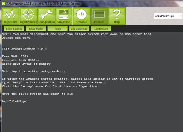 The Mission Planner Command Line interpreter is a serial terminal line editor that works similarly to the way the old DOS prompt operating systems used to work. If you want, you can set up and test APM is via a Command Line Interpreter (CLI). It is only available via the USB cable and it cannot be used via an Xbee or 3DR wireless telemetry connection. Open up the Terminal in the Mission Planner by selecting the Terminal tab (ensure that the serial baud rate is set for 115200). This will bring up the Terminal window, and it should automatically take you to the APM CLI menu (if not, click in the window and hit “Enter” three times):