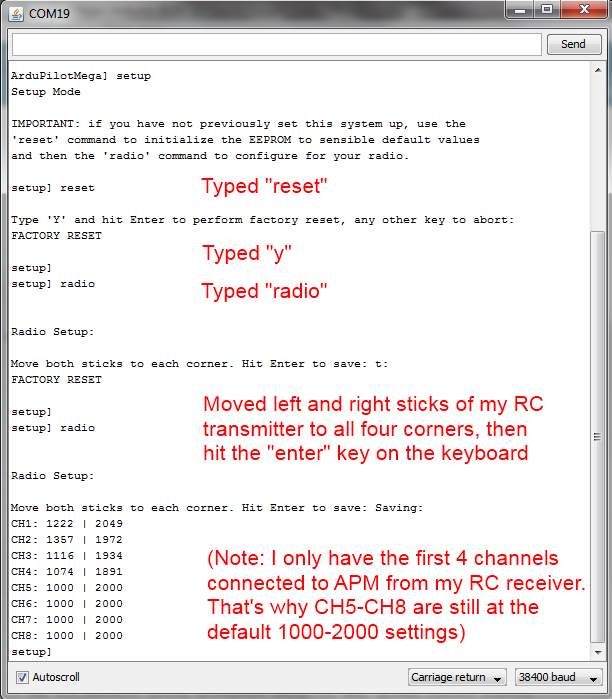 The Setup process configures APM for your particular RC radio settings and desired flight modes. Type “setup” and hit return to enter this mode. You MUST setup both radio and modes before you can fly. You should also test that you’re getting GPS lock (using the gps command in the test mode), which usually means testing outside where the GPS module has a clear view of the sky. Allowed setup commands are: