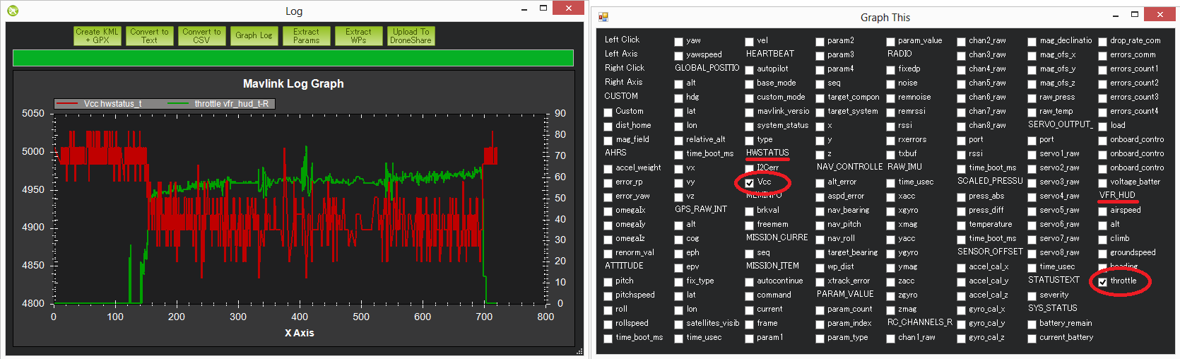 Interference from the power distribution board, motors, battery, ESCs and other electrical devices near the autopilot can throw off the compass heading which can lead to circling (aka “toilet bowling”) or even the copter flying off in completely the wrong direction. Graphing the tlog’s mag_field (found under “CUSTOM”) and throttle (found under VFR_HUD) is the easiest way to quickly see the amount of interference.