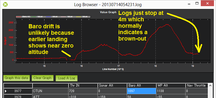 Power Modules provide a reliable power supply to the autopilot but brown-outs do still occasionally occur. They can normally be recognised by the logs suddenly ending while the vehicle is still in the air (i.e. barometer or EKF altitude is still reporting the vehicle’s altitude is well above zero).