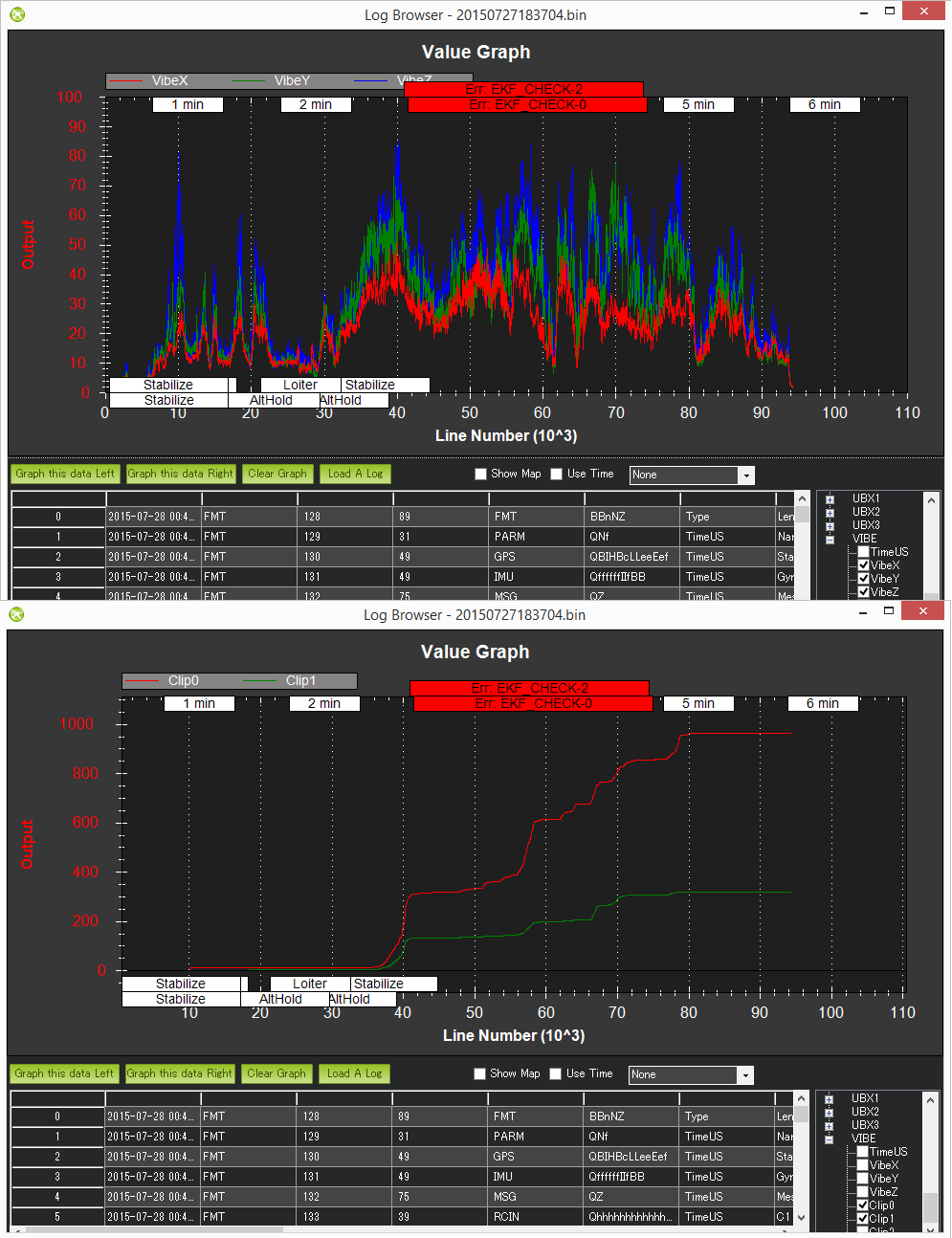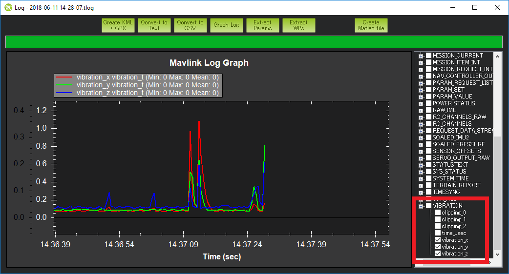 Tlog’s VIBRATION vibration_x, vibration_y and vibration_z can also be used and show the same information as is stored to the dataflash log