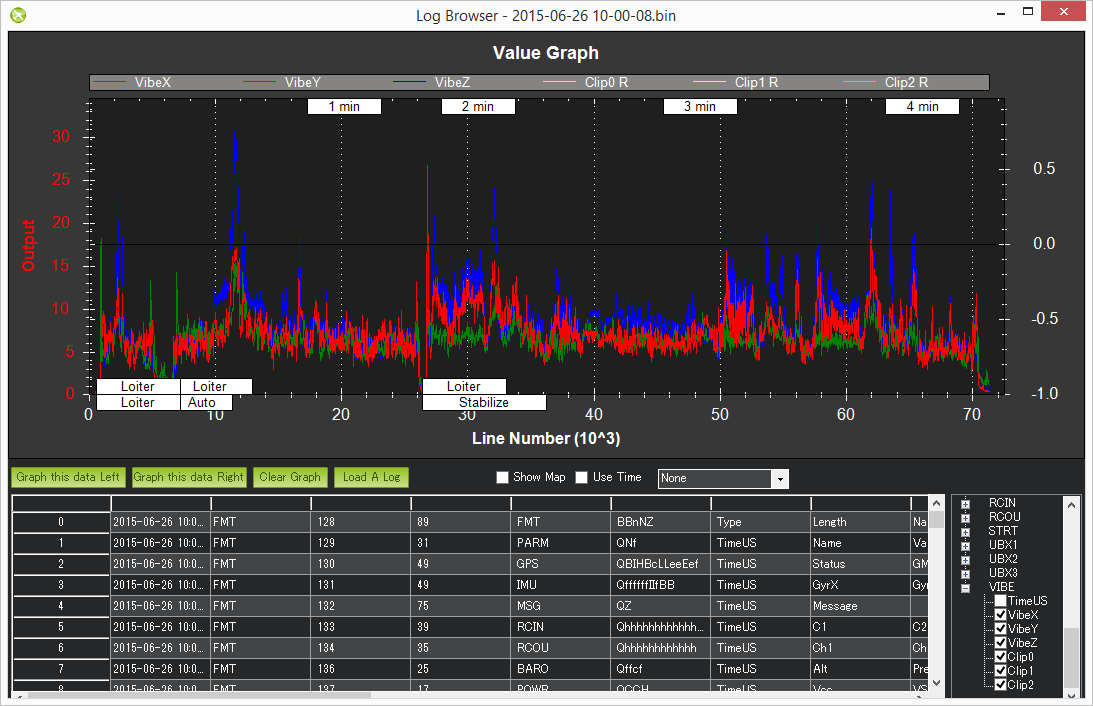 As covered on the Measuring Vibration page, vibrations are best viewed by graphing the VIBE message’s VibeX, VibeY and VibeZ values. Vibration levels below 30m/s/s are normally acceptable. Levels above 30m/s/s may have problems and levels above 60m/s/s nearly always have problems with position or altitude hold.