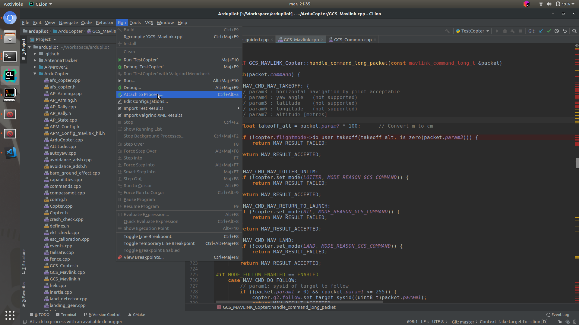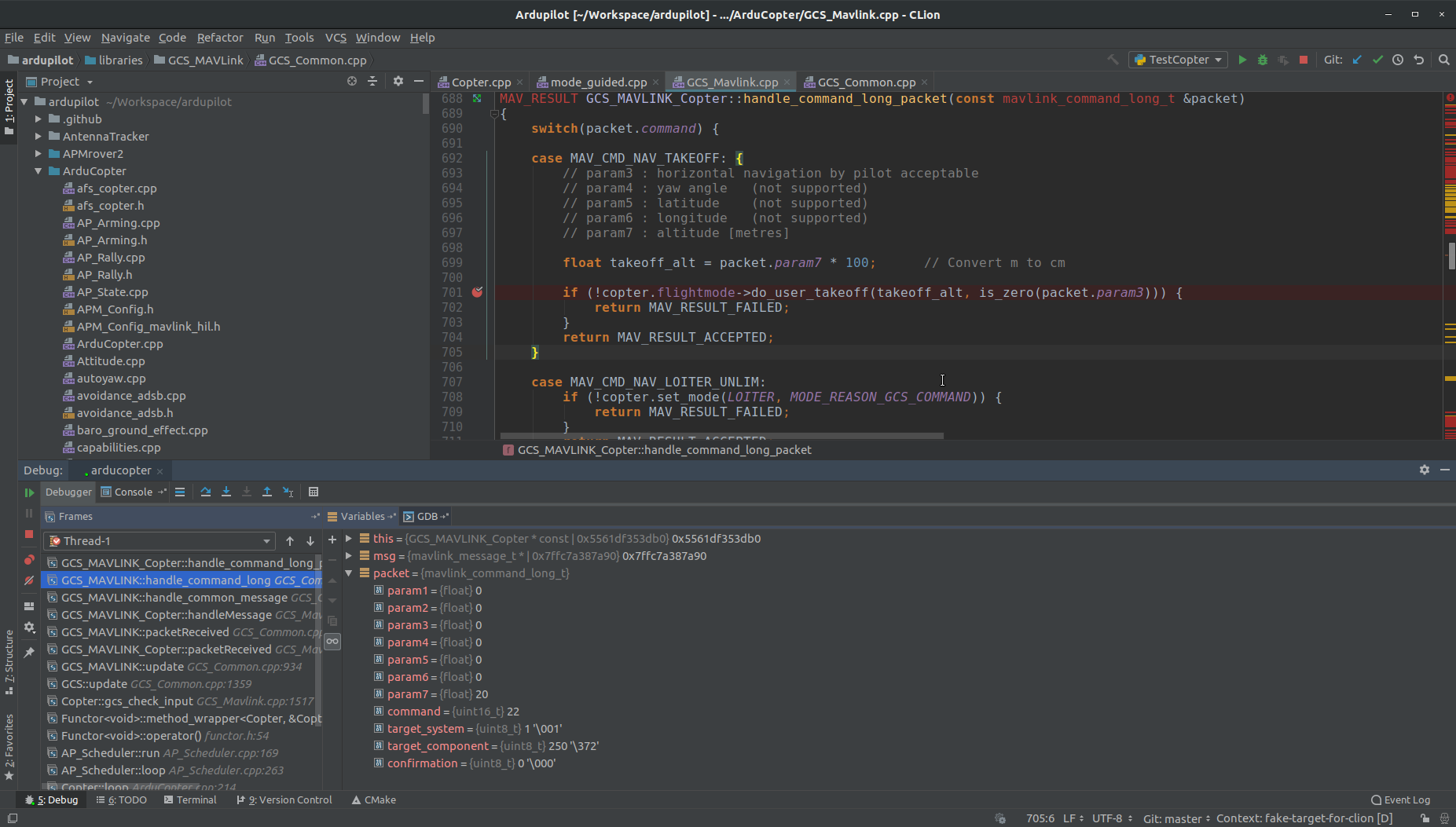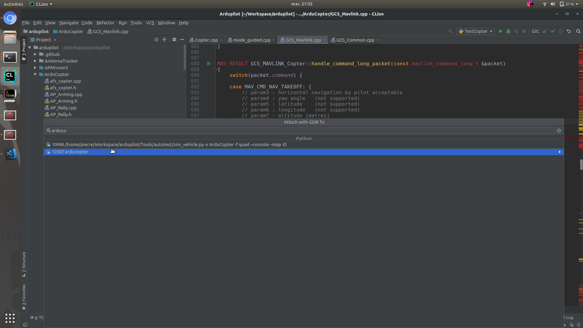 When gdb is launched you should be able to use it to debug ArduPilot like any other program. If you don’t know how to use gdb from commandline, please look on the net for some tutorial, a simple one can be found here. Don’t forget that you can crash your drone on SITL safely !