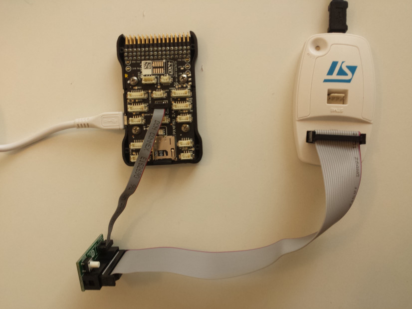 The ST-Link debugger should be connected to the STM32’s JTAG connector using the JTAG breakout cable. Connect the SWDIO and SWCLK (see Debug port pinout for reference) to the corresponding SWDIO and SWCLK pins on the ST-Link debugger.