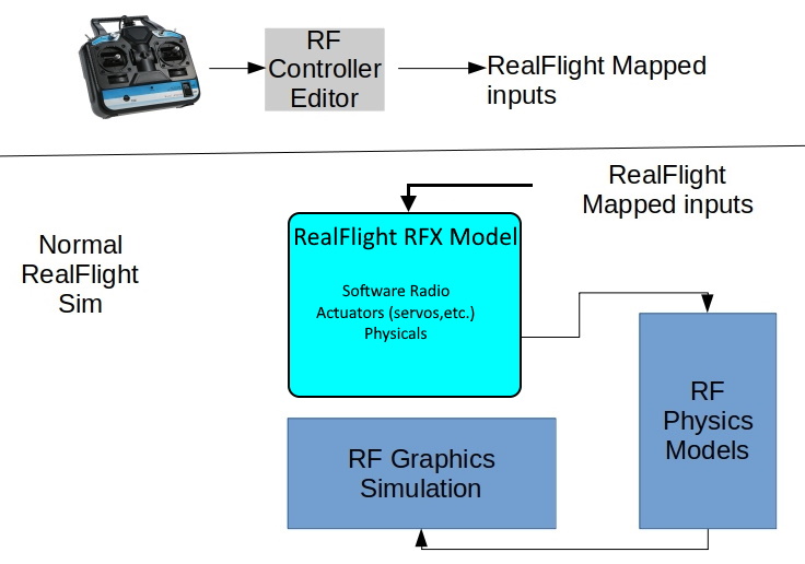 In a normal RealFlight (RF) simulation, RF has built-in models, physics modeling, and graphic interpreter/display. Control is input via a simulation controller, such as the Interlink controller, joystick, or OpenTX transmitter in joystick mode.