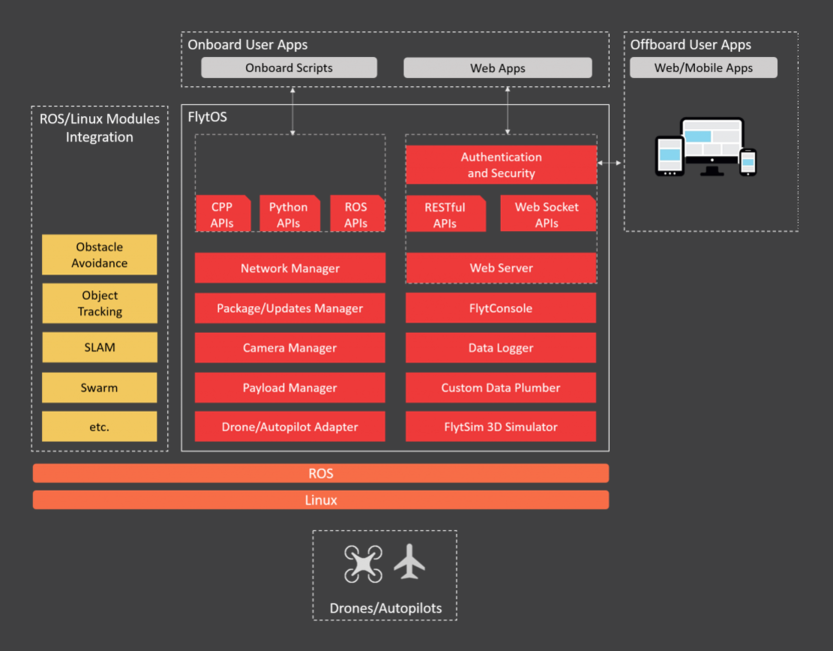 FlytOS is based on Linux and ROS (Robot Operating System), making it an ideal platform for building commercial as well as research orientated drone applications. It supports a wide range of hardware options such as Raspberry Pi 3, Odroid XU4, Nvidia TX1, Intel Edison, Intel Aero and FlytPOD. It uses MAVLink to communicate with the autopilot, and exposes high level FlytAPIs in ROS, CPP, Python, REST and Websocket.