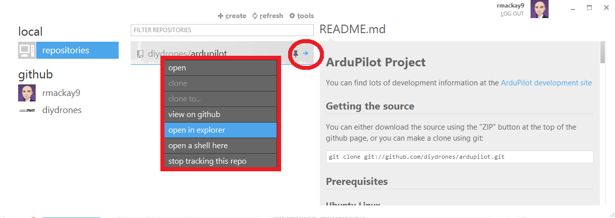 On GitHub client click the right arrow button to view a list of recent commits or right-mouse-button click on the ardupilot/ardupilot repository and “open in explorer”.