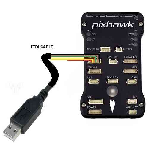 If using an FTDI cable, connect as shown in the picture below, DO NOT connect the power wire.