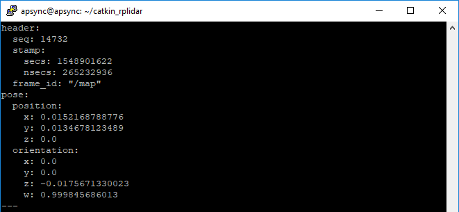 To confirm the ROS side is working correctly type the command below and live updates of position estimates from cartographer should be displayed