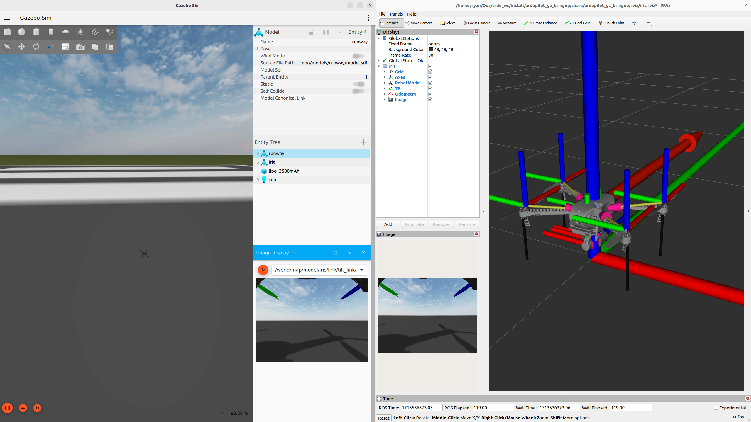 By default, this launch file starts ArduPilot SITL, Gazebo, and RViz with a single command.
