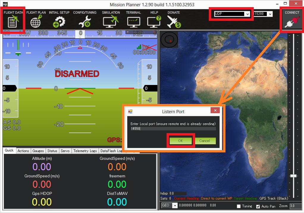 Next connect with the mission planner after first setting the “COM Port” to “UDP”.