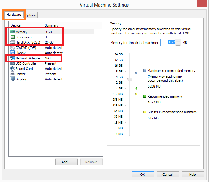 On the Hardware tab set Memory: 3GB,Processors: 4,Hard Disk: 20GB,Network Adapter: NAT