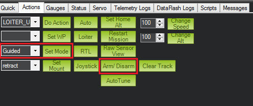 Mission Planner: Actions Tab (Set Mode, Arm/Disarm)¶