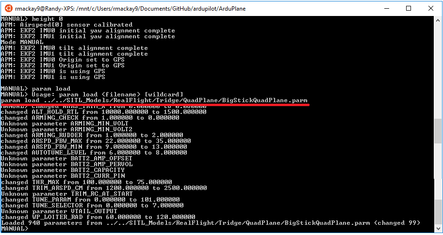 param load <filename>to load the parameter found in the same directory as the model, as in the above example. You may have to load them again, after typingparam fetch, in order to load parameters that require enabling before presenting their parameter set. And in some cases you may need to restart SITL in order for some parameters to take effect.![]()