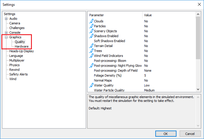 For Evolution, you may be able to use the defaults since its graphics performance is improved. You can check the performance after connecting to SITL, as discussed below, by opening the “NavGuides” widget in Realflight. The “Graphics Frames/Sec” count needs to be over 200 for the vehicle to fly well. If it is too low, you can change similar settings in the “Settings->Graphics” Hardware and Quality sub-menus for items as described above until sufficient frame rates are obtained.