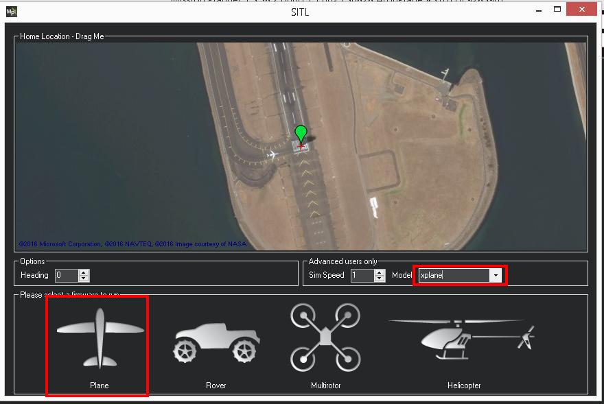 In the Simulation screen you need to select Model “xplane” and then select “Plane”. At the moment we only support fixed wing and helicopter aircraft in X-Plane with SITL. In the future we may support other aircraft types. See below for more information on flying a helicopter.